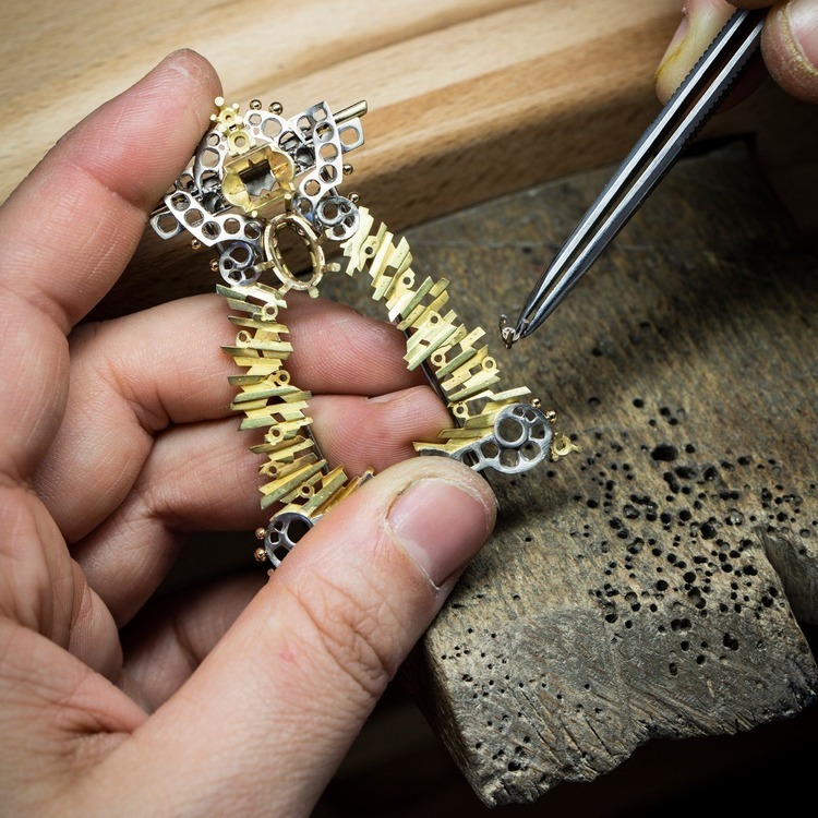 Crafted as a miniature sculpture, the piece depicts Hebe, the Greek goddess of youth, pouring ambrosia onto the mortal world. Her gown features a snow setting of diamonds, creating a brilliant sparkle. An openwork structure surrounding her—composed of polished gold, textured gold, and diamonds of varied cuts—evokes the undulating forms of a garden landscape.