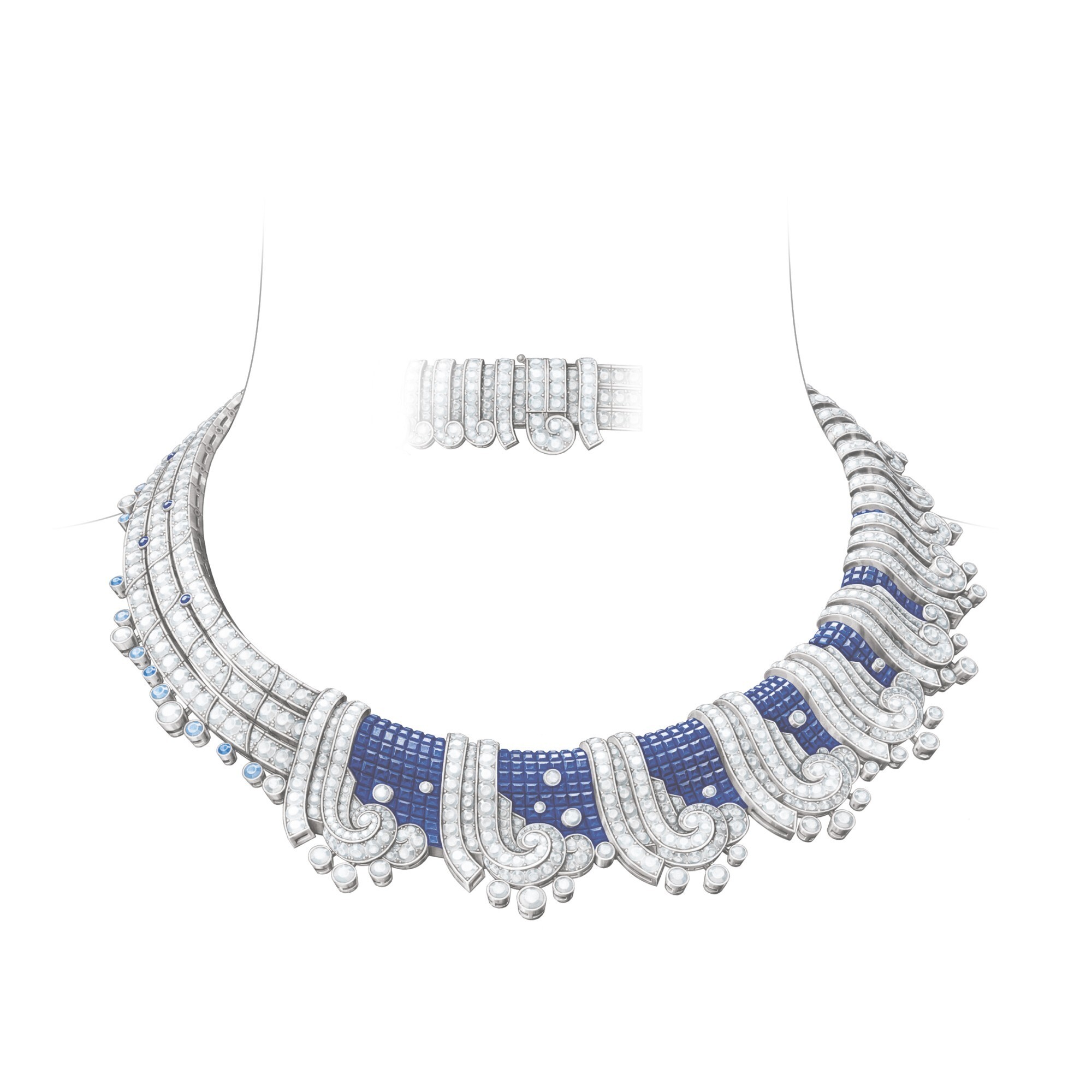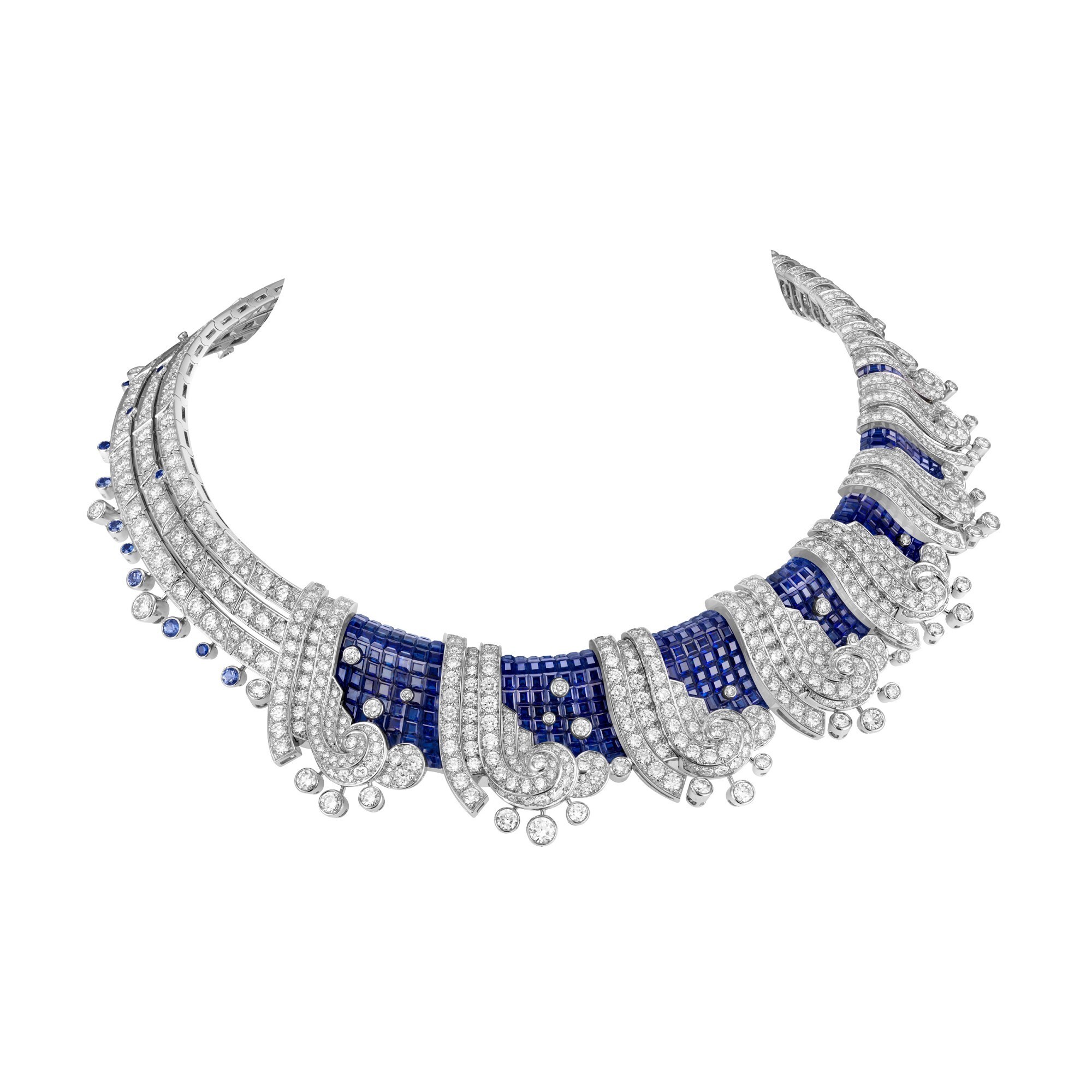 Van Cleef & Arpels unveiled the Écume Mystérieuse necklace in its 2024 “Treasure Island” High Jewelry collection, a masterful creation that evokes the blue ocean of an adventurous voyage. Through the use of invisible-set sapphires, the Maison recreates the depth and movement of the sea, while round brilliant-cut diamonds depict poetic white waves, resulting in a design that feels both pure and lyrical.