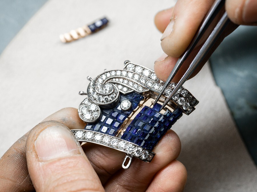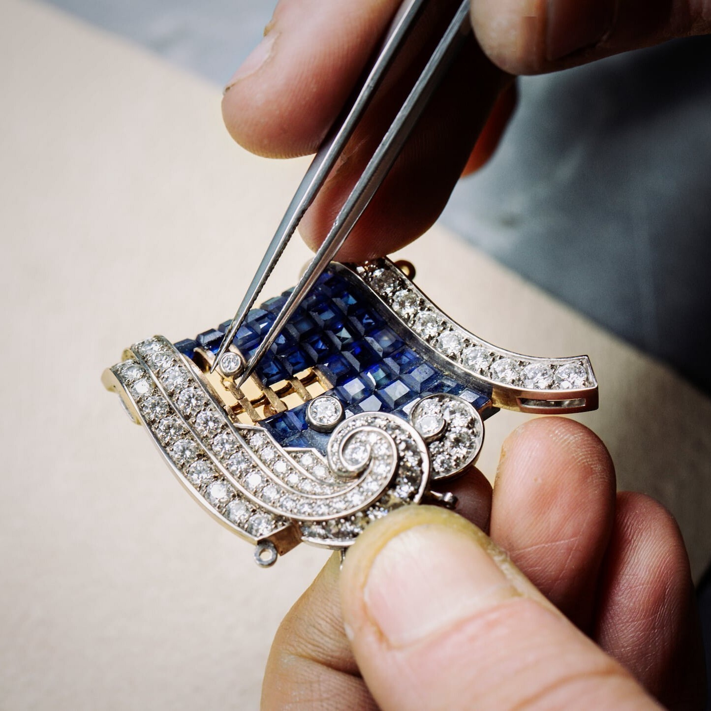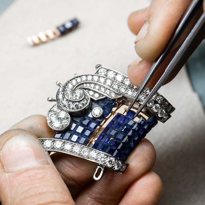 The “Mystery Set” (Serti Mystérieux) is one of Van Cleef & Arpels’ most iconic techniques, celebrated for its extraordinary precision. This intricate process allows gemstones to be set seamlessly without any visible prongs, creating a smooth, continuous surface of color. In this piece, the sapphires are individually custom-cut to ensure perfect harmony in hue and shape, forming a rich, deep blue expanse that captures the viewer’s imagination.