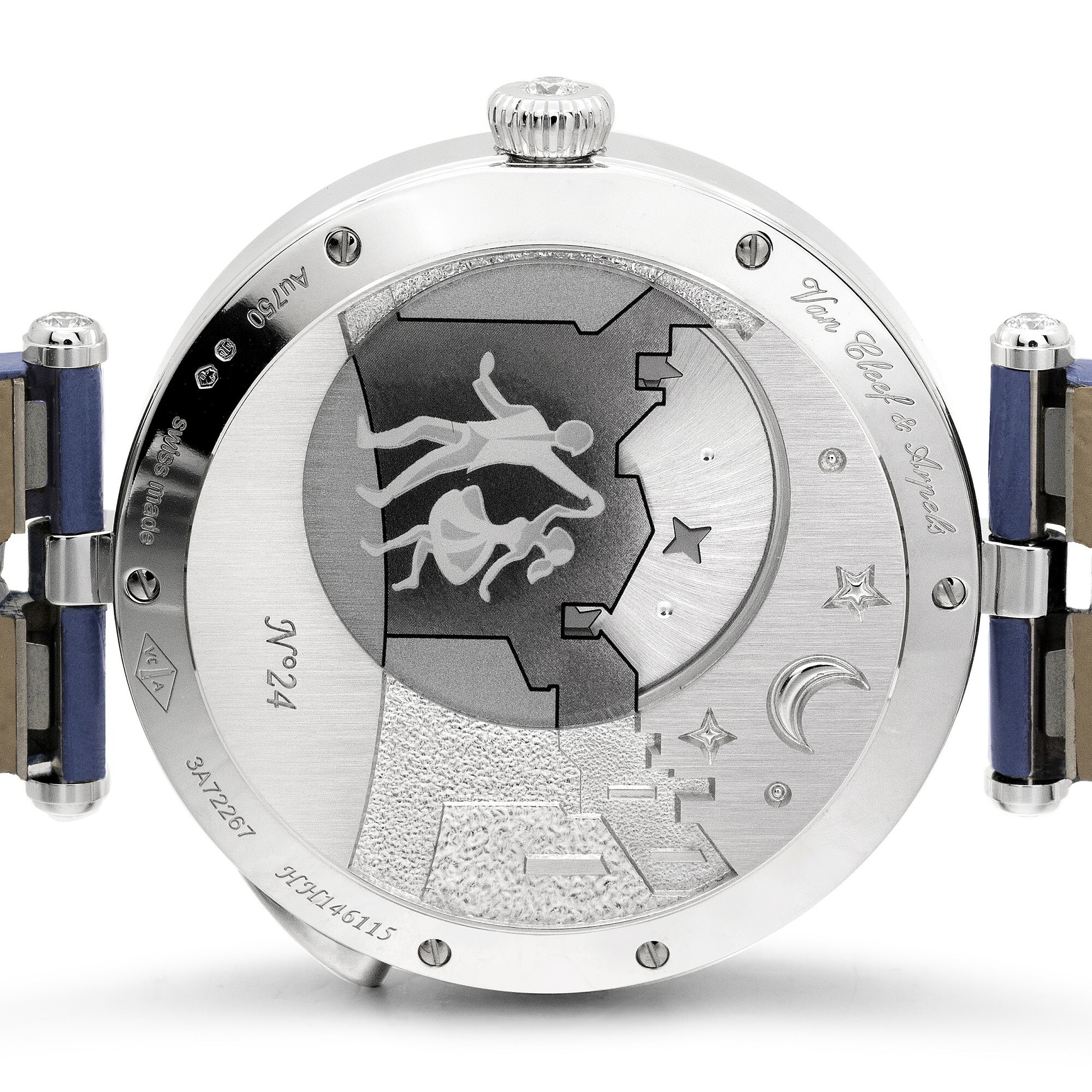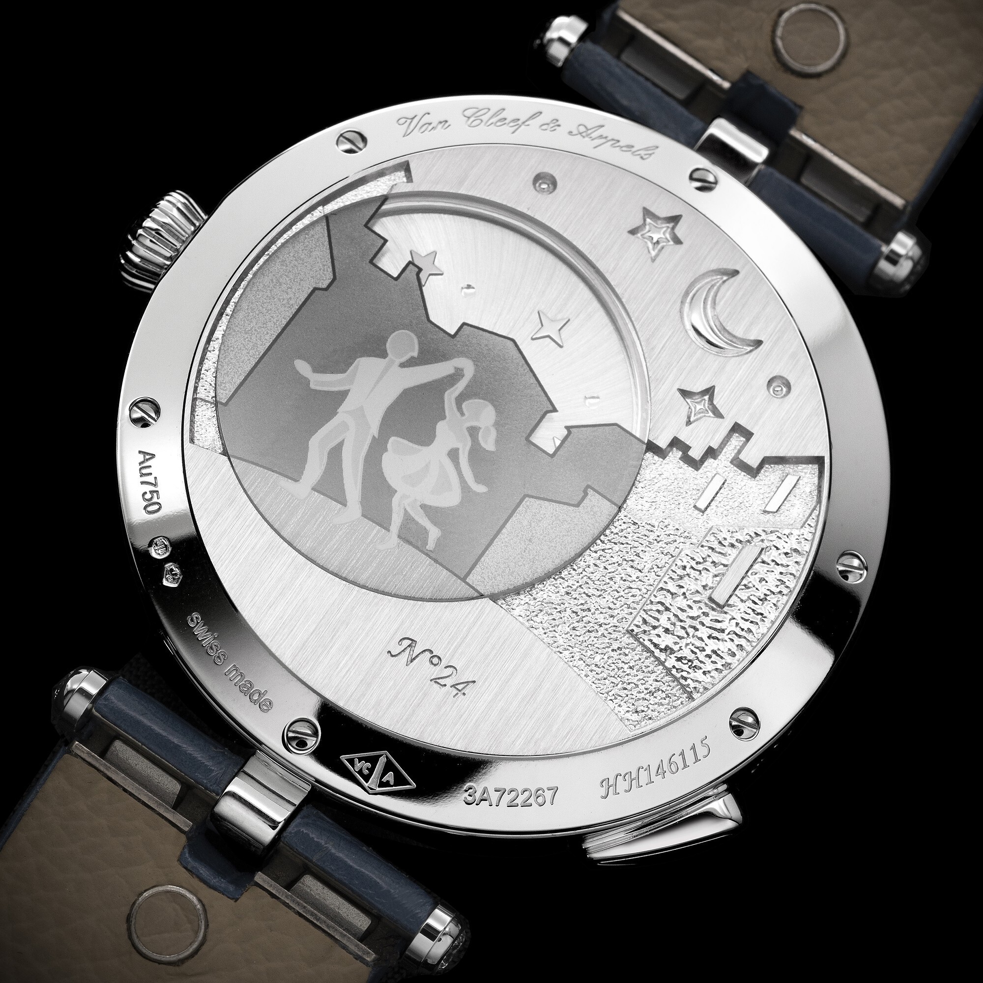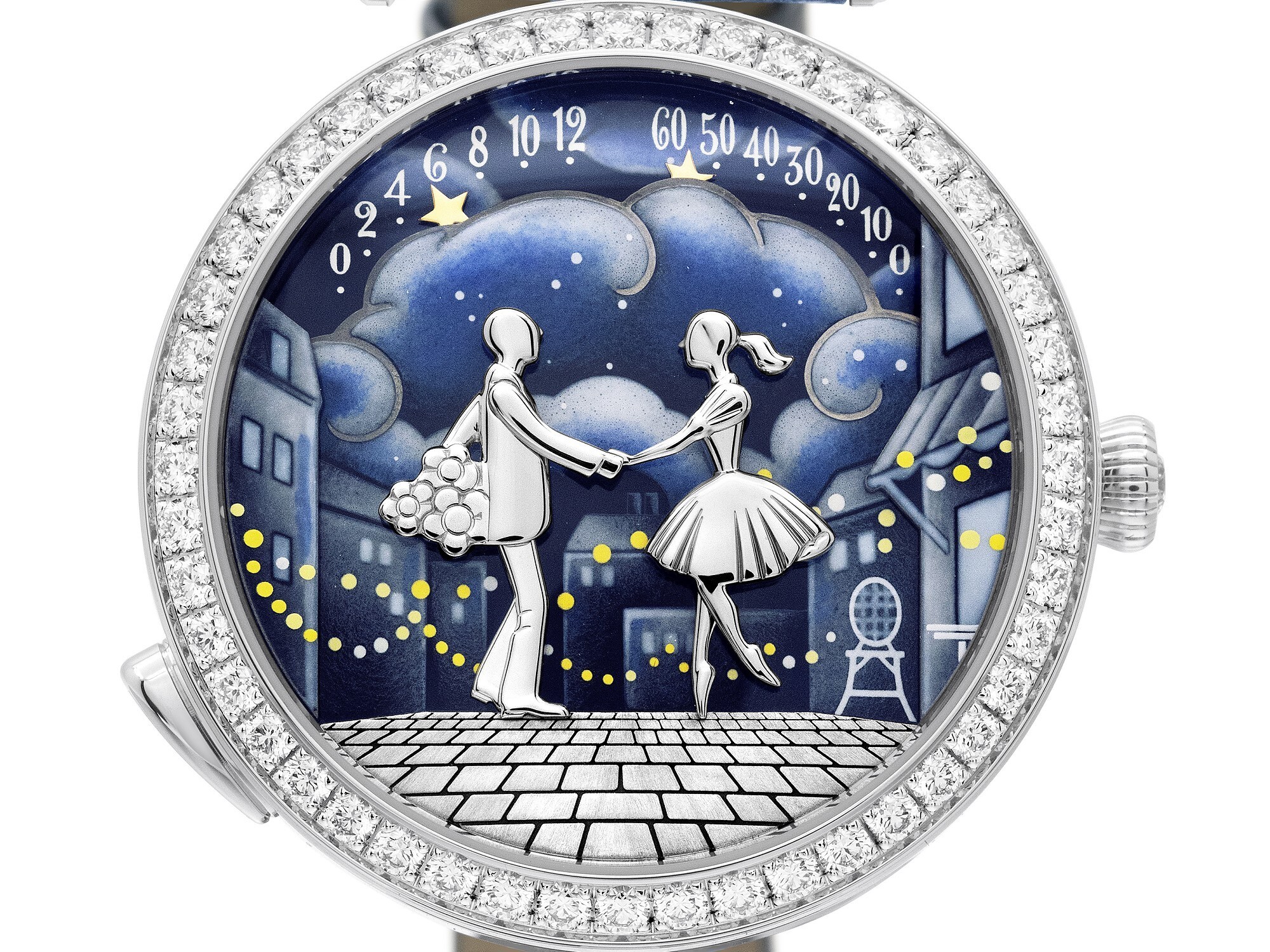 The 38mm white gold case houses an automatic movement offering a 36-hour power reserve, enhanced by Van Cleef & Arpels’ in-house retrograde module. Turning the watch over reveals an exquisite relief engraving of the lovers dancing hand in hand beneath a starlit sky — a perfect continuation of the story depicted on the dial.