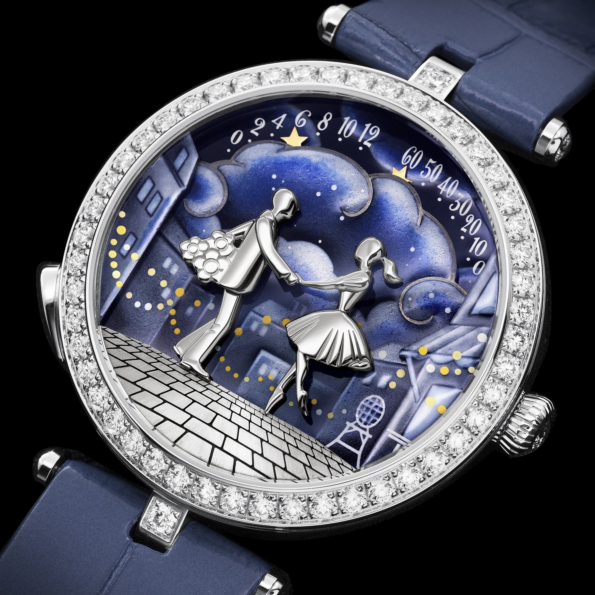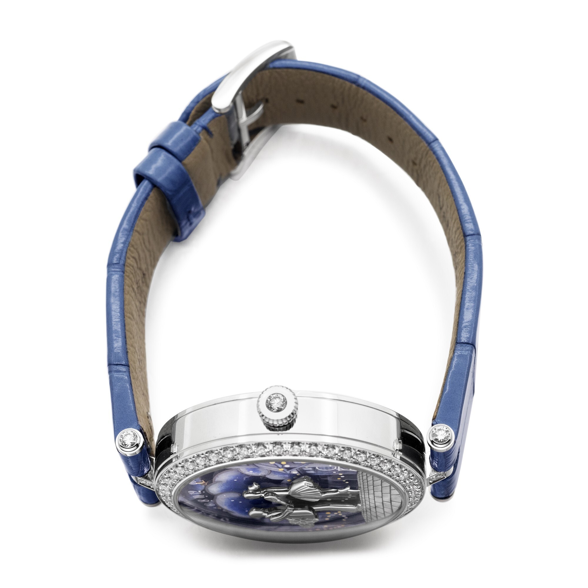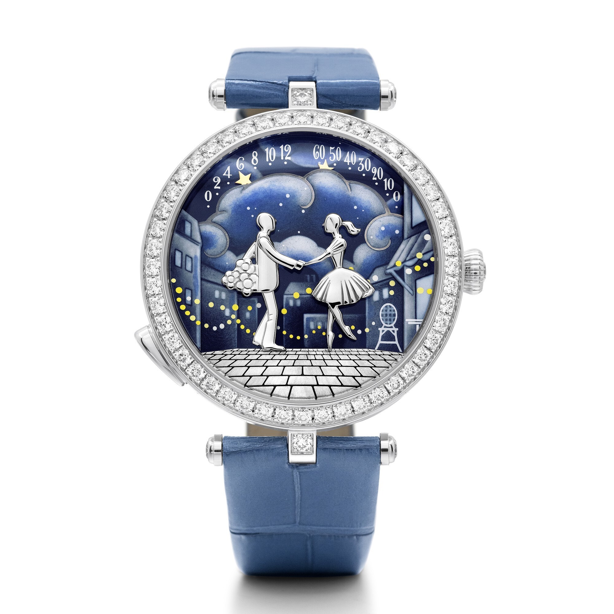 38mm 18K white gold case, diamond-set bezel, and white gold crown set with a brilliant-cut diamond. Sapphire crystal glass. Grisaille and Coloured Grisaille enamel dial with star-shaped hands. Powered by a self-winding mechanical movement offering a 36-hour power reserve. Blue alligator leather strap with white gold pin buckle. Water-resistant to 30 metres.