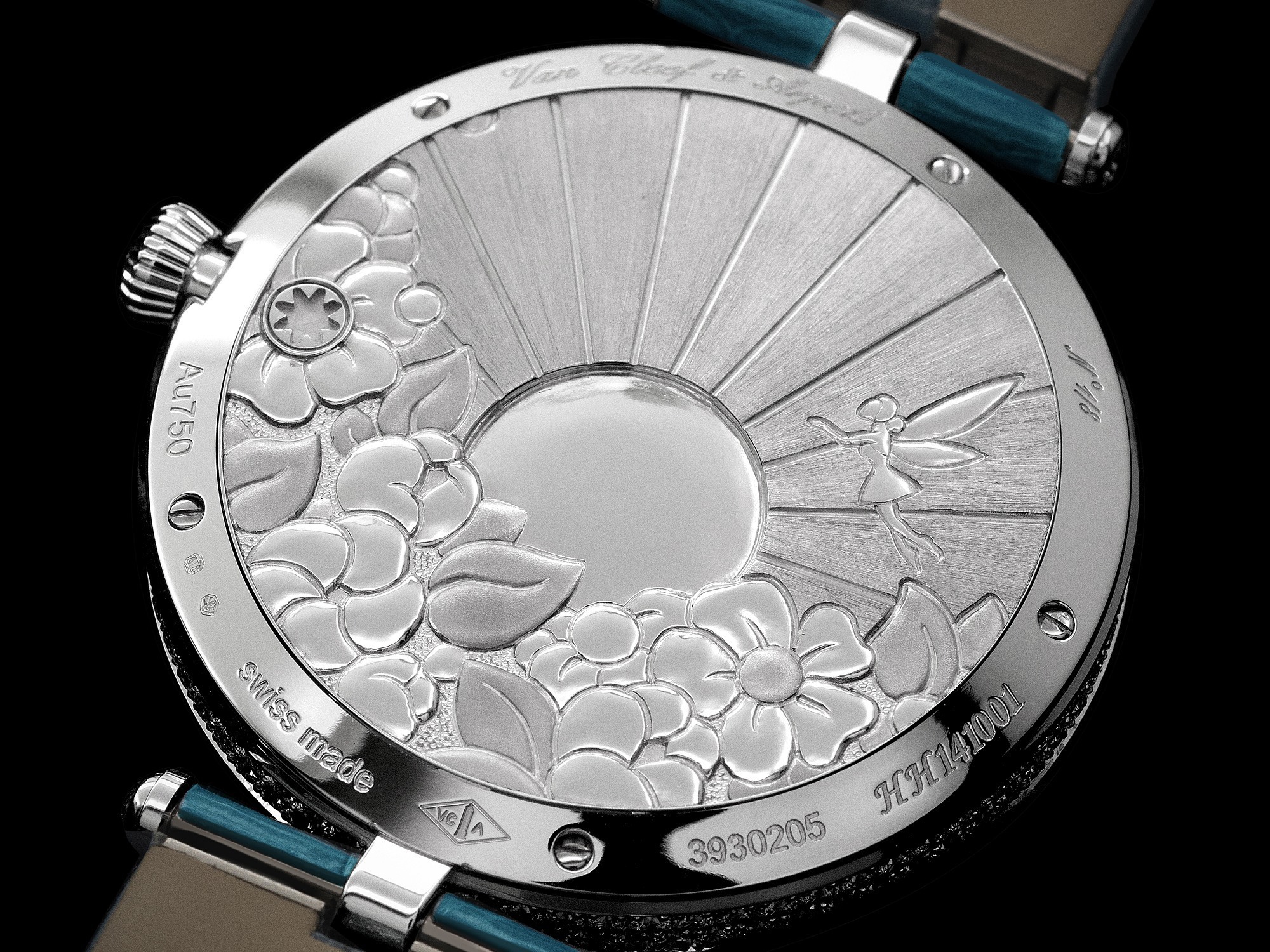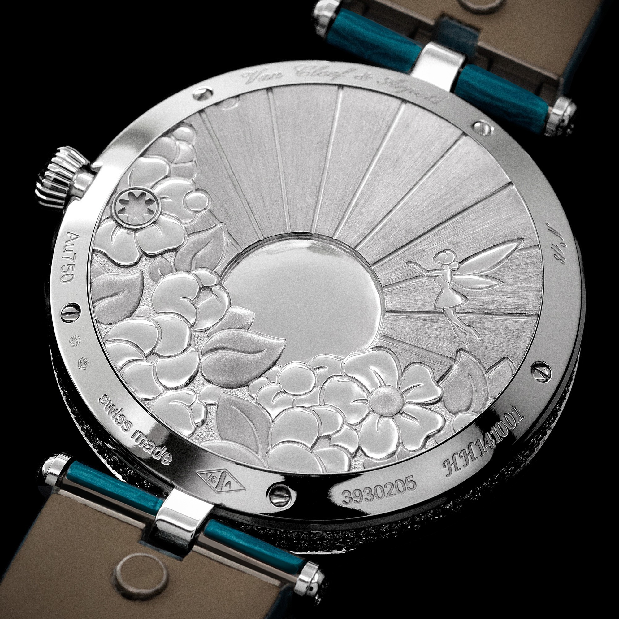The dial is adorned with custom-cut slices of turquoise, evoking a serene sky. A golden sun, meticulously crafted from spessartite garnets and diamonds, forms the stage above which the delicate blued steel hour and minute hands glide gracefully. In the lower left portion of this miniature scene, a fairy dances lightly among pink enamel flowers. Her face is set with a rose-cut diamond, and she holds a delicate “flower” carved from a pink sapphire. Her wings, crafted using the plique-à-jour enamel technique, exhibit an exceptionally slender and translucent quality.