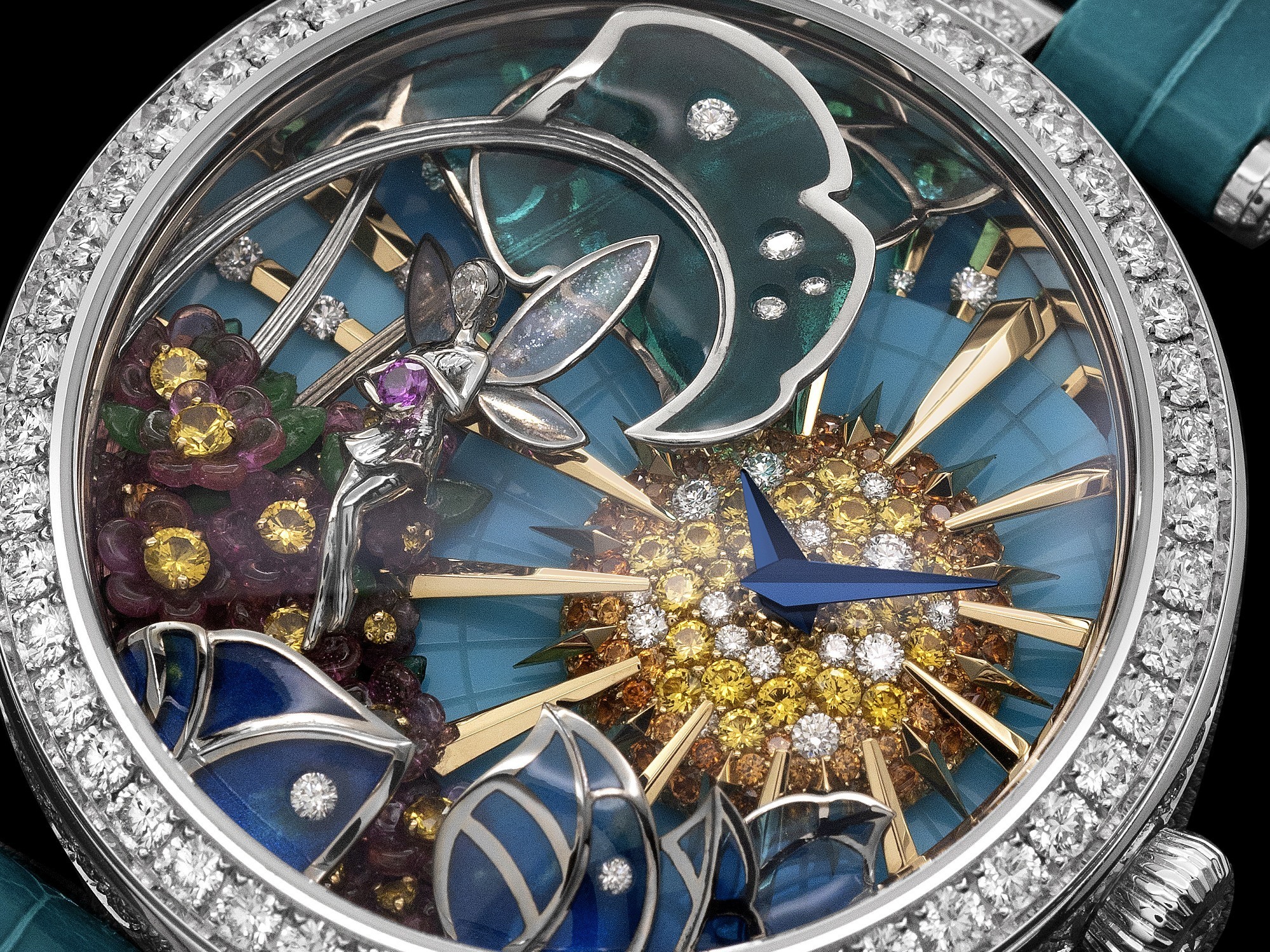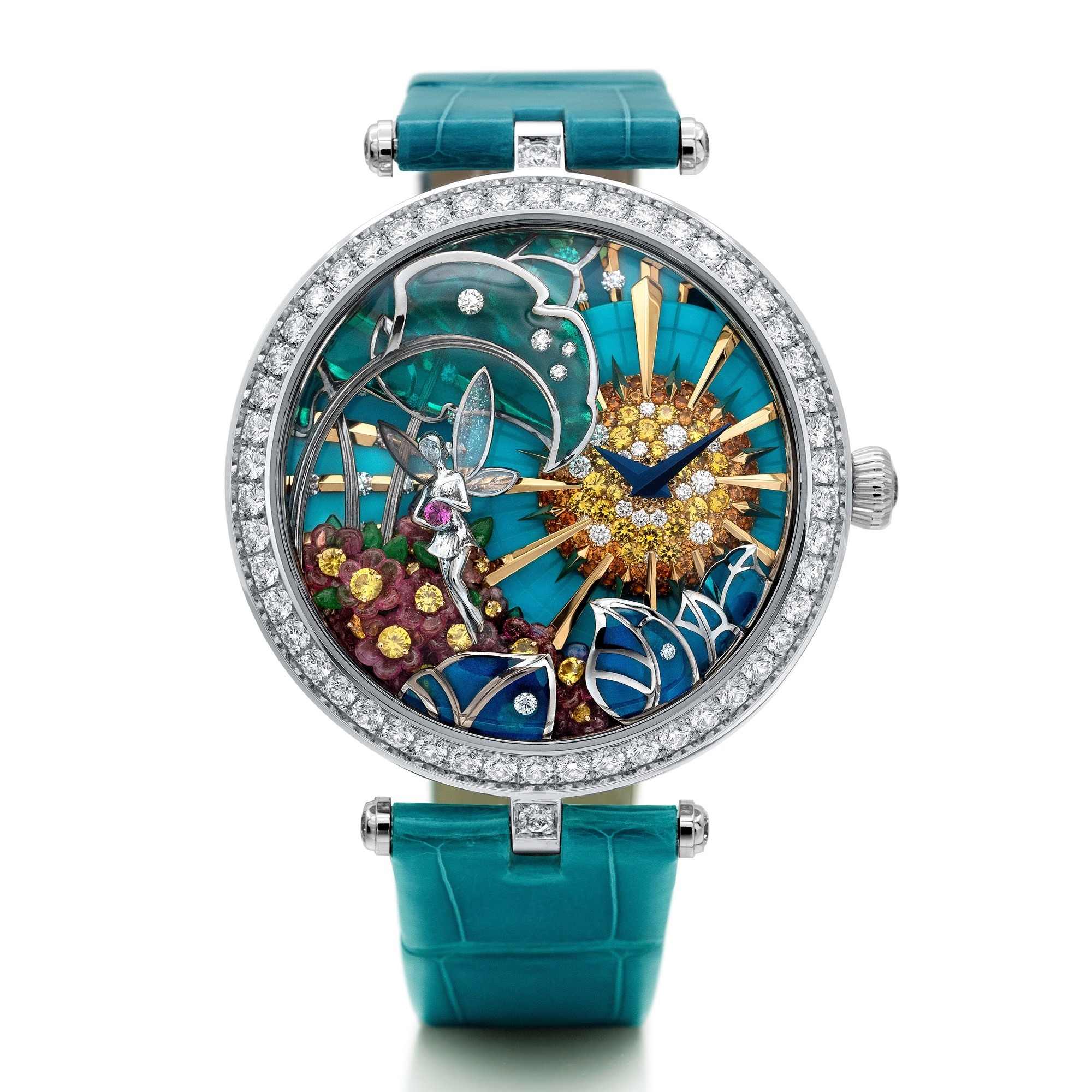 The dial is adorned with custom-cut slices of turquoise, evoking a serene sky. A golden sun, meticulously crafted from spessartite garnets and diamonds, forms the stage above which the delicate blued steel hour and minute hands glide gracefully. In the lower left portion of this miniature scene, a fairy dances lightly among pink enamel flowers. Her face is set with a rose-cut diamond, and she holds a delicate “flower” carved from a pink sapphire. Her wings, crafted using the plique-à-jour enamel technique, exhibit an exceptionally slender and translucent quality.