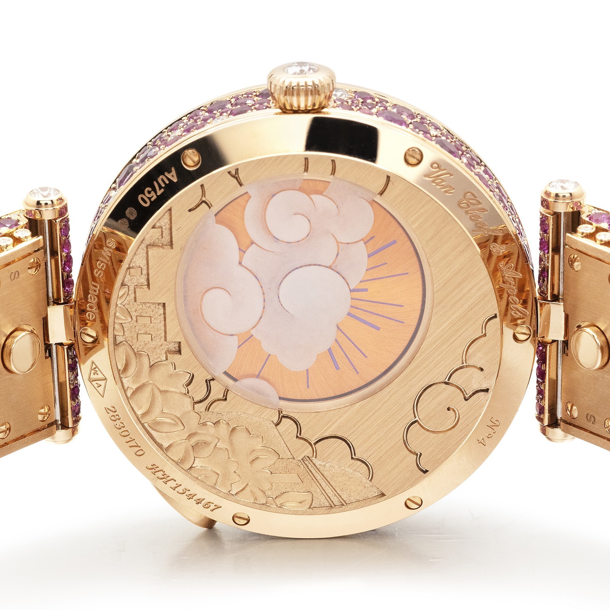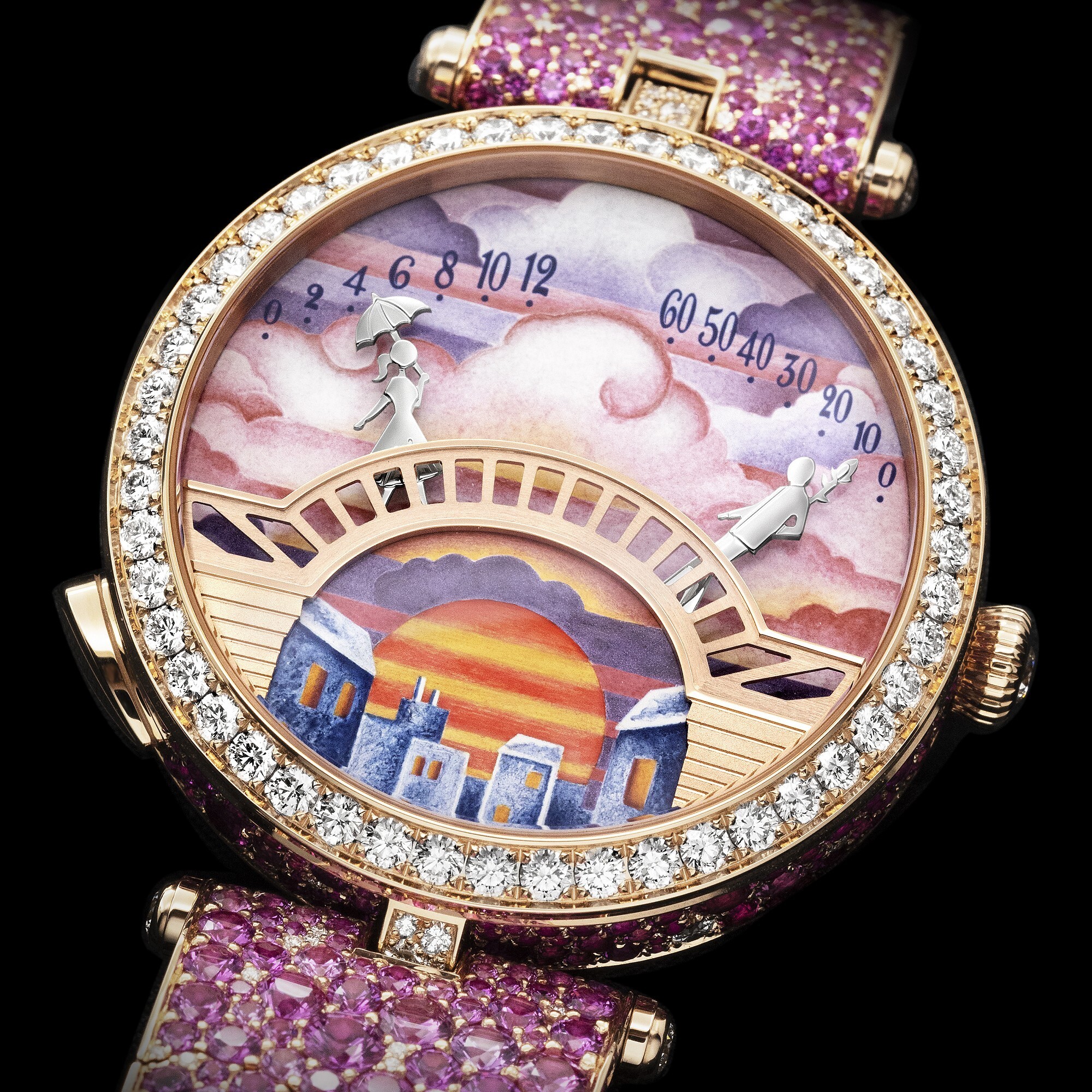 The 38mm pink gold case houses an automatic movement with a 36-hour power reserve, integrated with a retrograde module exclusively developed by Van Cleef & Arpels. Turning the watch over reveals a engraved scene on the case back showing a sunset view over Parisian rooftops at dusk, perfectly continuing the narrative of the dial.