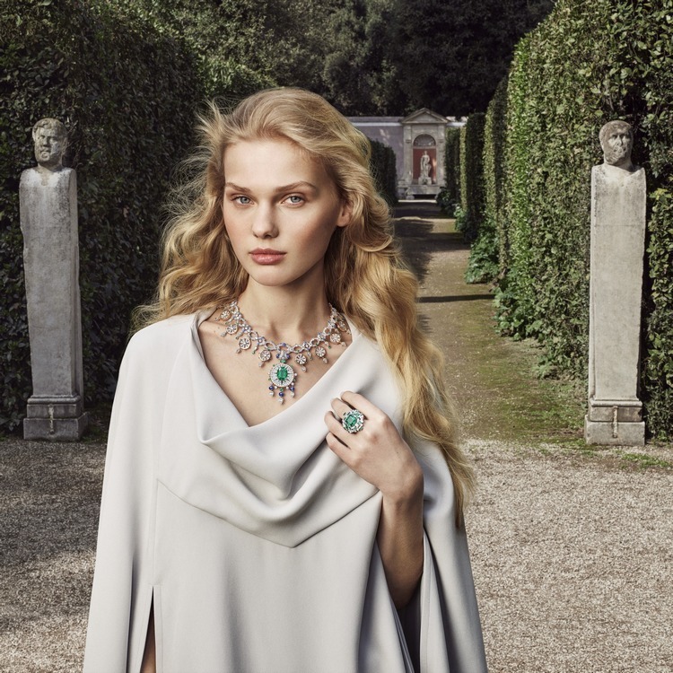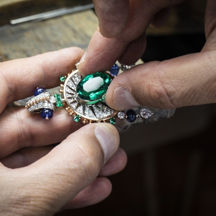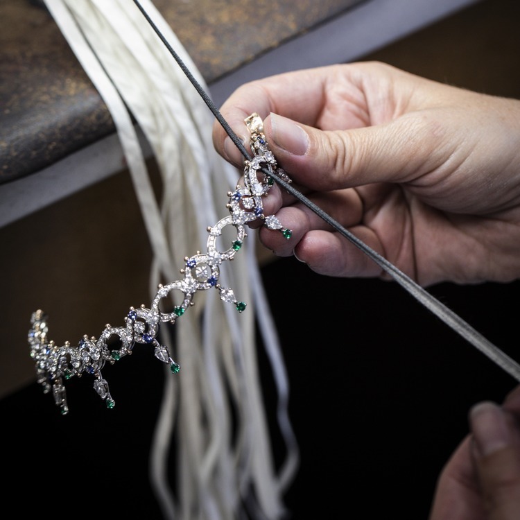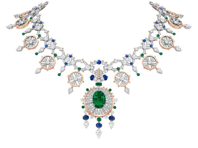 The designer captures the circular outline of St. Peter’s Square in rose gold, complemented by pear-shaped diamonds resembling the radiating pathways of the square. Alternating and overlapping geometric elements create a balanced and expansive visual effect, echoing Bernini’s architectural aesthetics. The collar is symmetrically set with round-cut diamonds, sapphires, and emeralds, their colors striking and vibrant.
