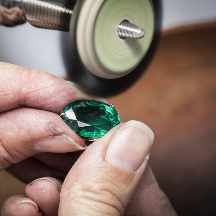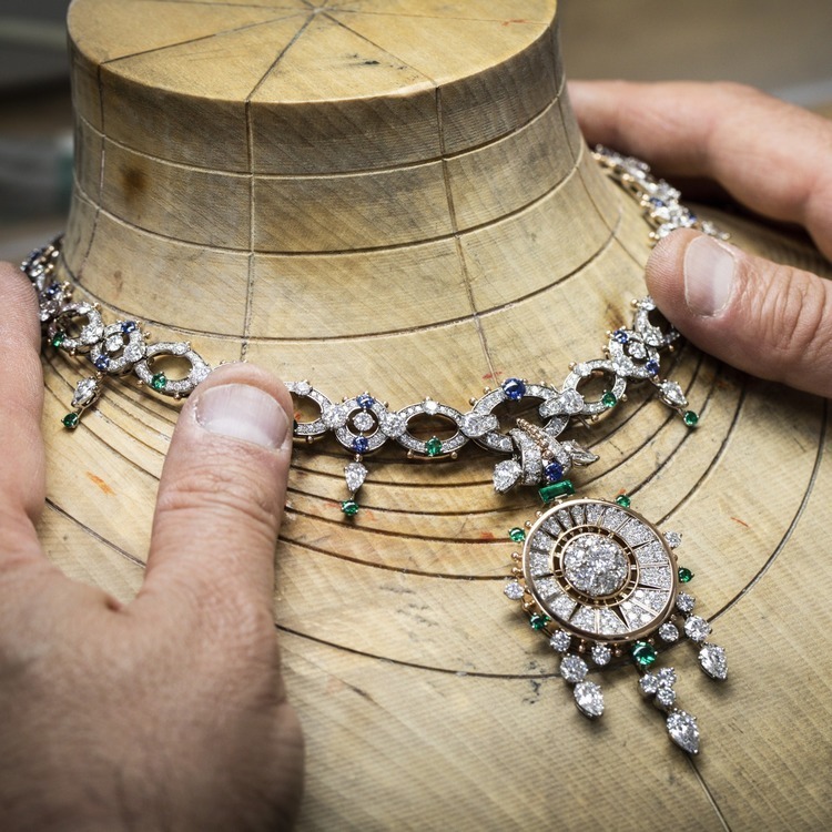 Radiating from the central stone, the pendant extends with patterns crafted from diamonds and platinum. A fringe suspended below is linked together by diamond and emerald beads, sapphire beads, and pear-shaped diamonds. This combination of geometric elements once again echoes the inspirational theme of the entire piece: Piazza San Pietro.
