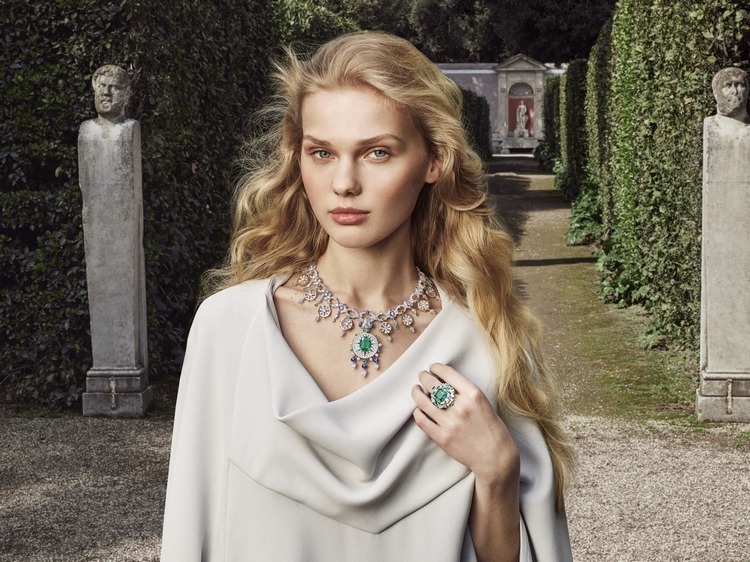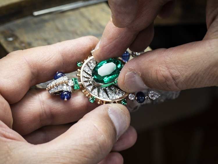 Van Cleef & Arpels presents this colored gemstone necklace in its 2023 “Le Grand Tour” High Jewelry collection. Inspired by the famous Roman landmark Piazza San Pietro (St. Peter’s Square), it skillfully constructs an opulent architectural style through layered geometric elements. The centerpiece is set with an exceptionally rare 13.09-carat oval-cut Ethiopian emerald.