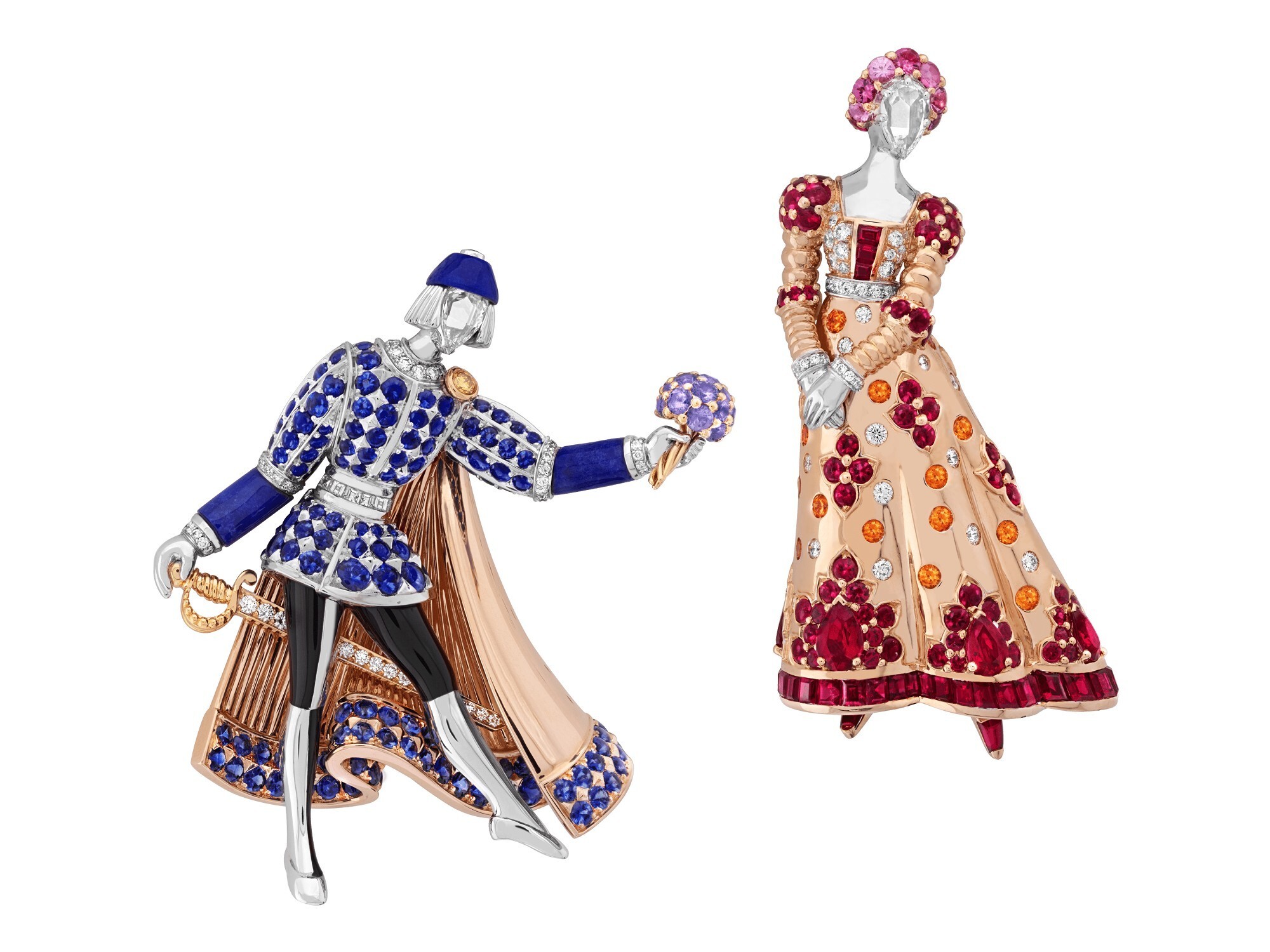 This set of brooches is part of Van Cleef & Arpels’ high jewelry collection Romeo & Juliet, inspired by Shakespeare’s timeless tragedy. Through motifs of pomegranates and the figures of the star-crossed lovers, the Maison recreates the romance of their secret balcony encounter, evoking the vitality and elegance of the Italian Renaissance.