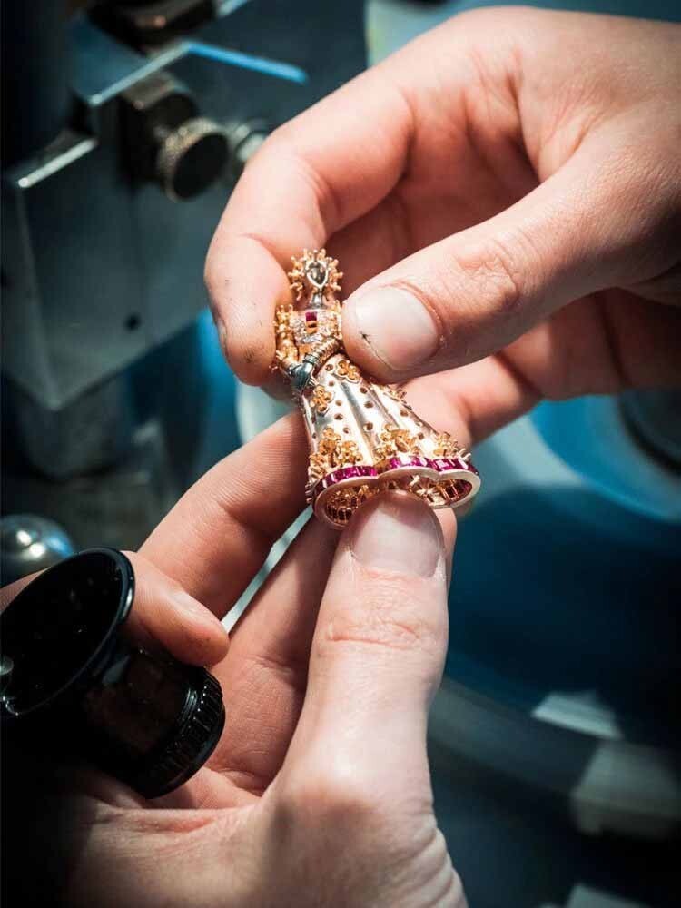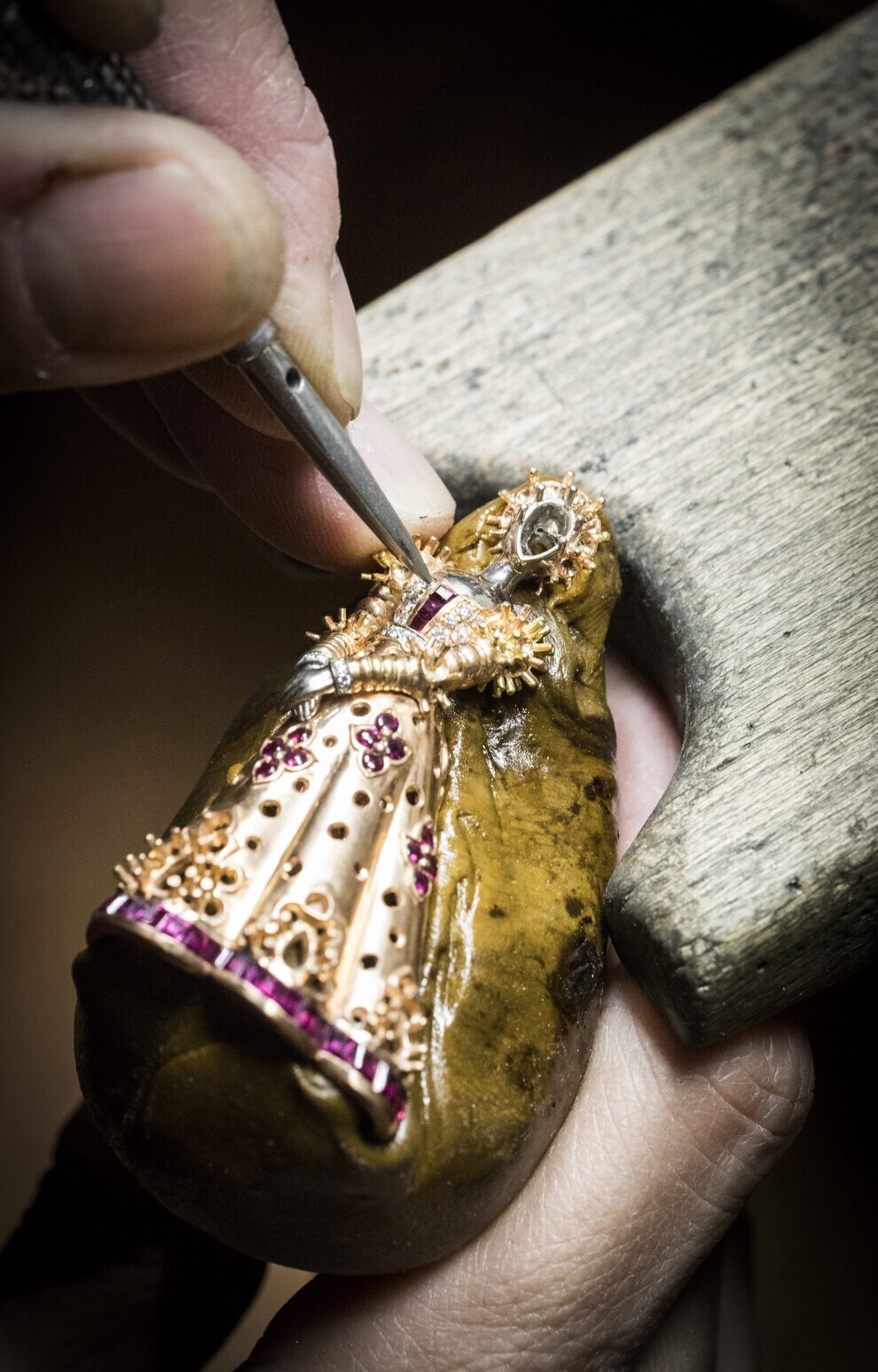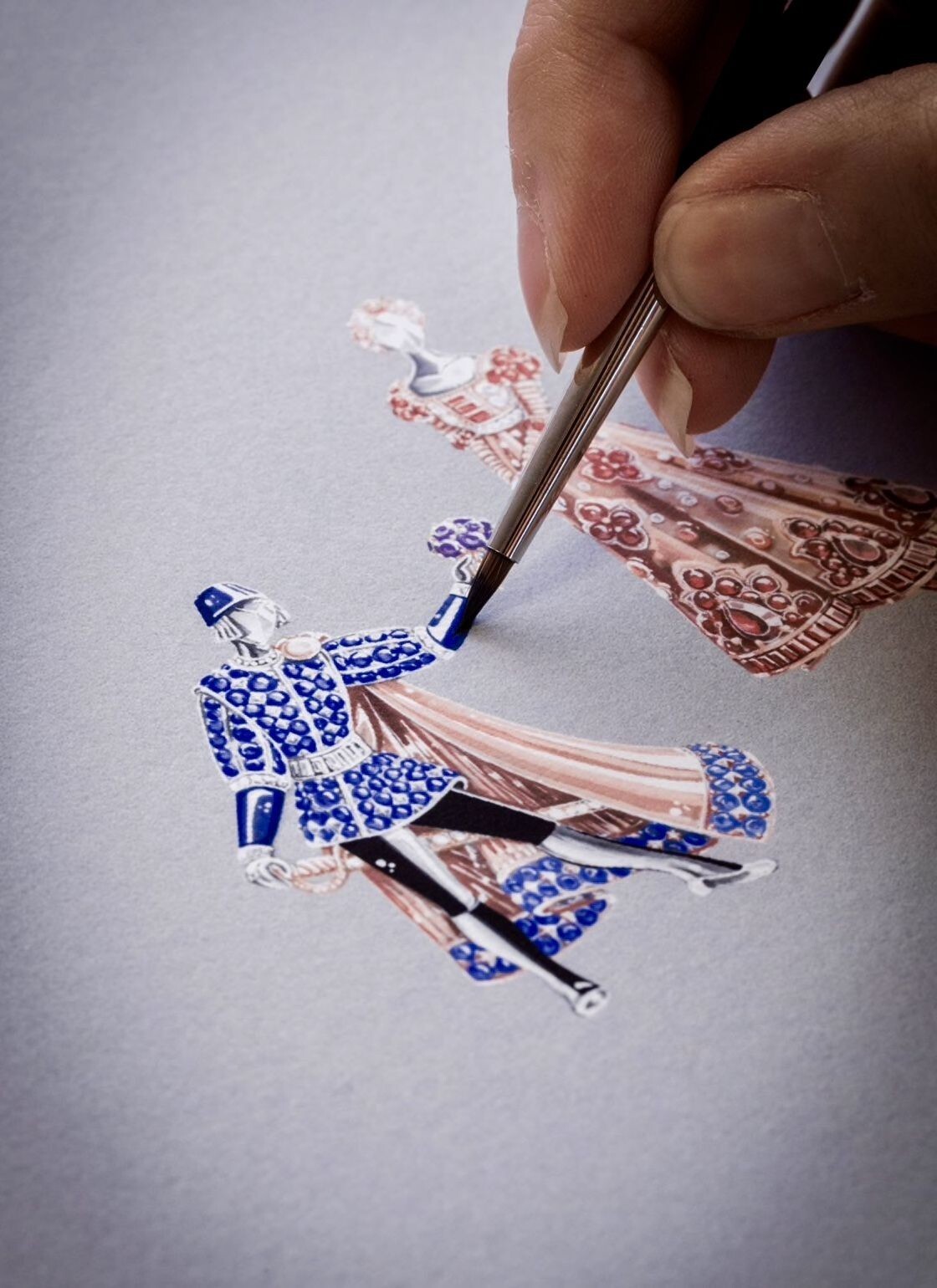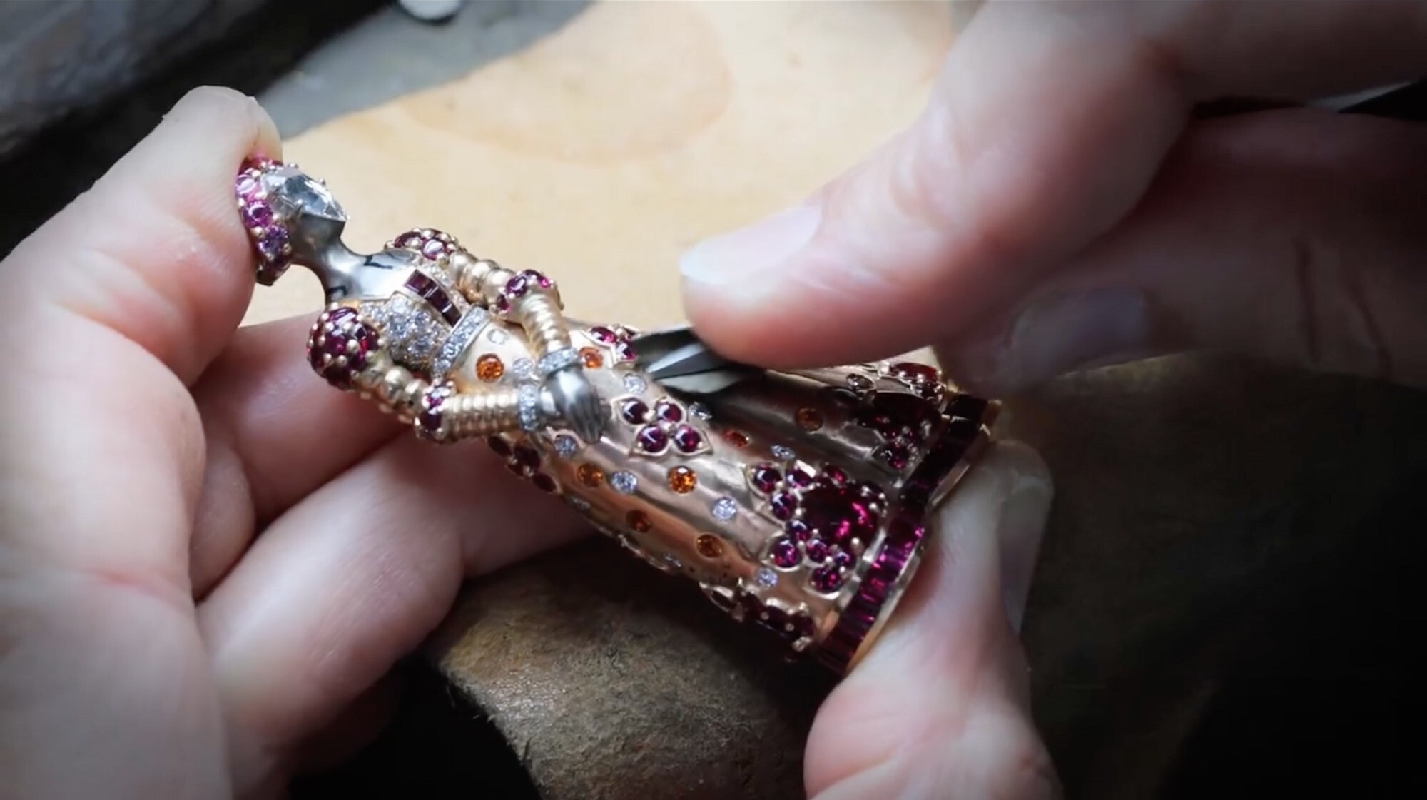The Romeo & Juliet brooch revisits the Maison’s signature “ballerina” brooch design, capturing the tender moment when Romeo presents a flower to Juliet. Juliet’s face, formed by a pear-shaped rose-cut diamond, radiates softness and modesty. Her rose gold gown features natural folds, lavishly set with orange sapphires, garnets, rubies, and diamonds that form a richly ornate skirt pattern.