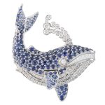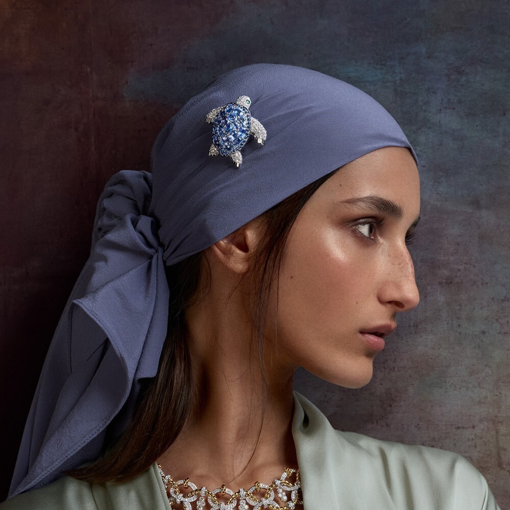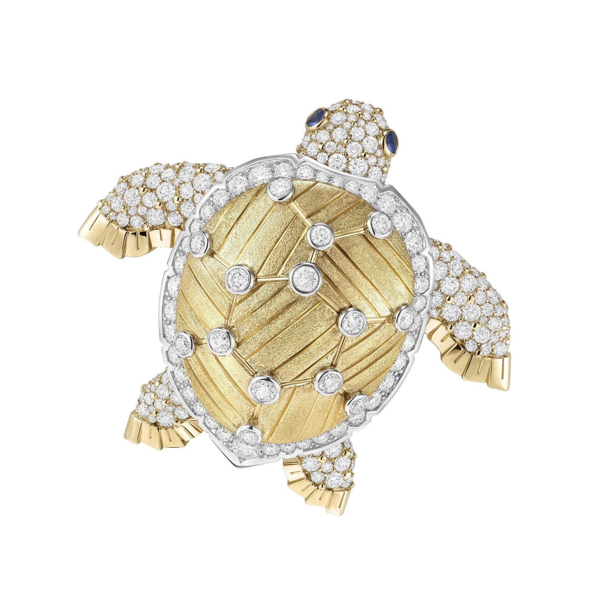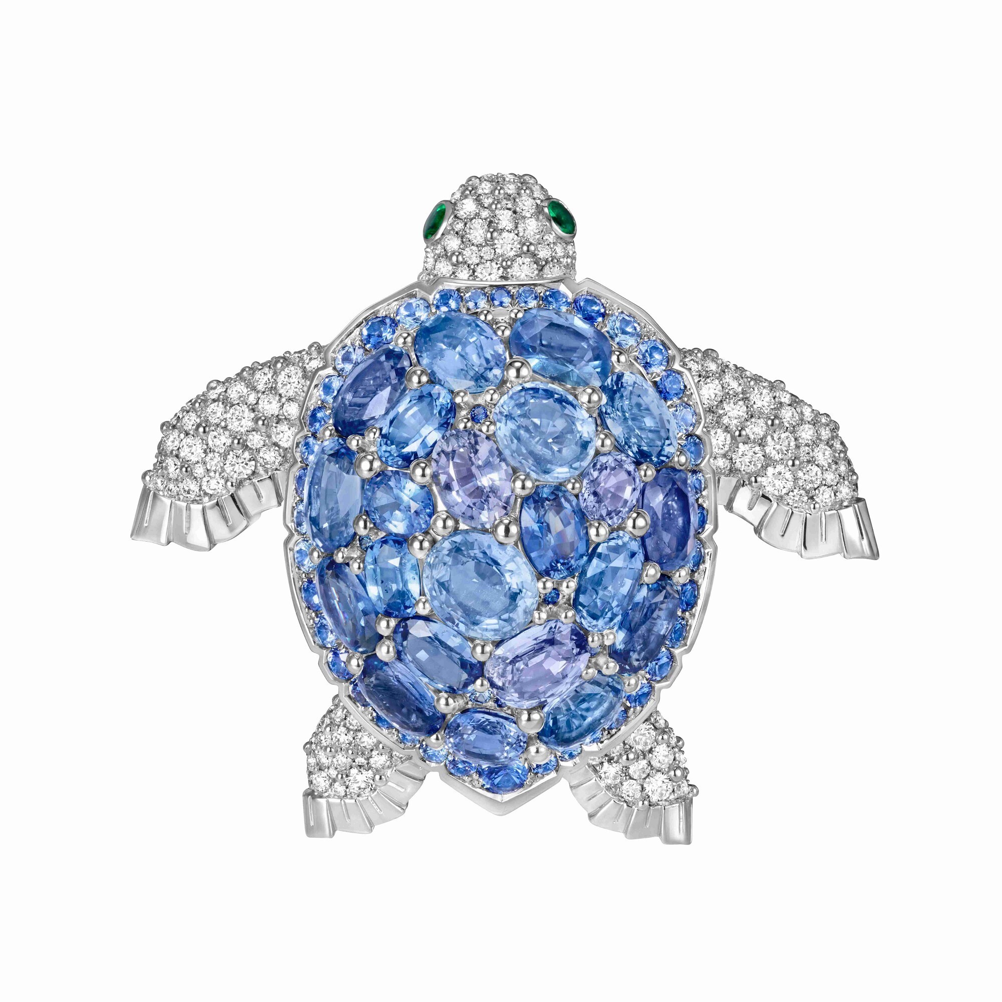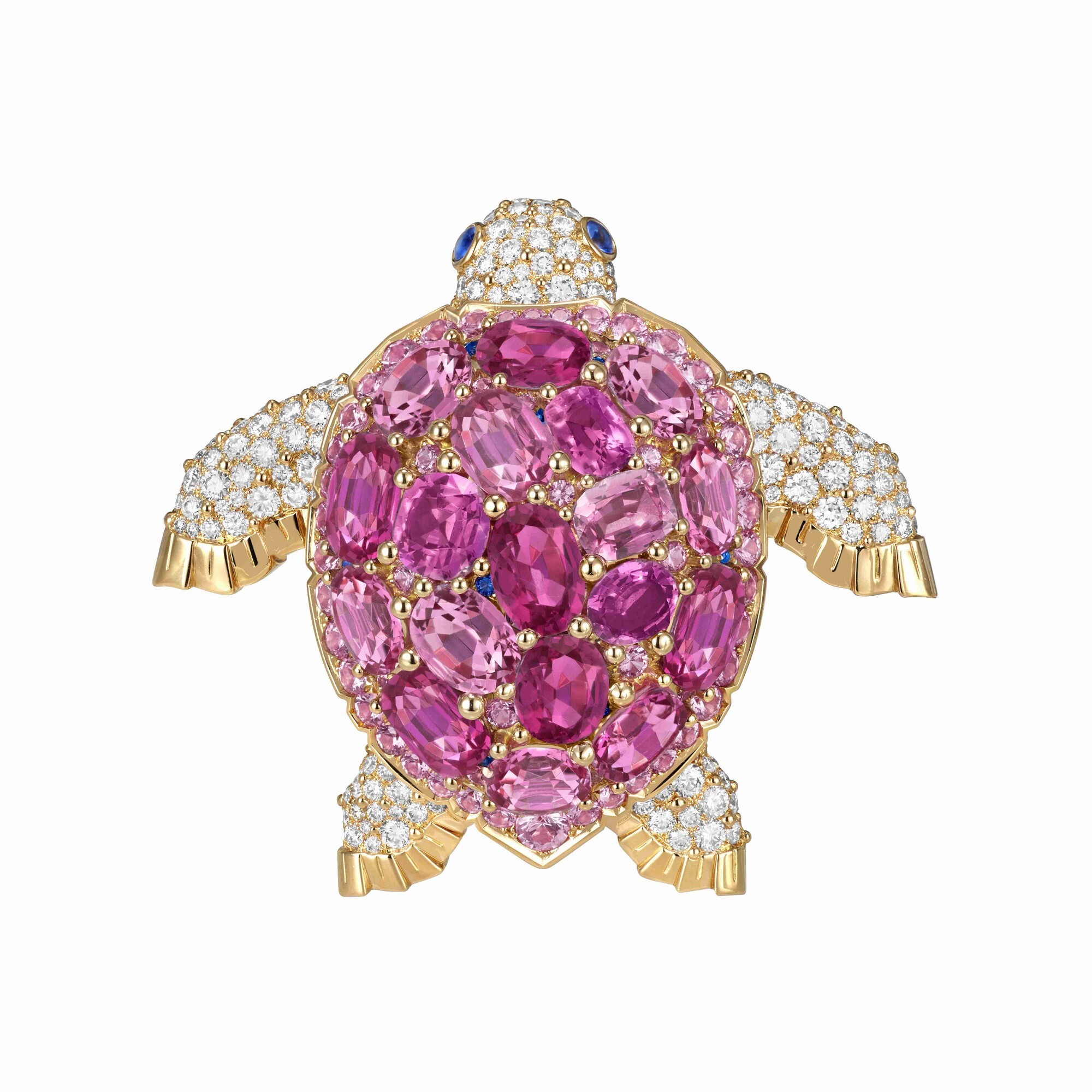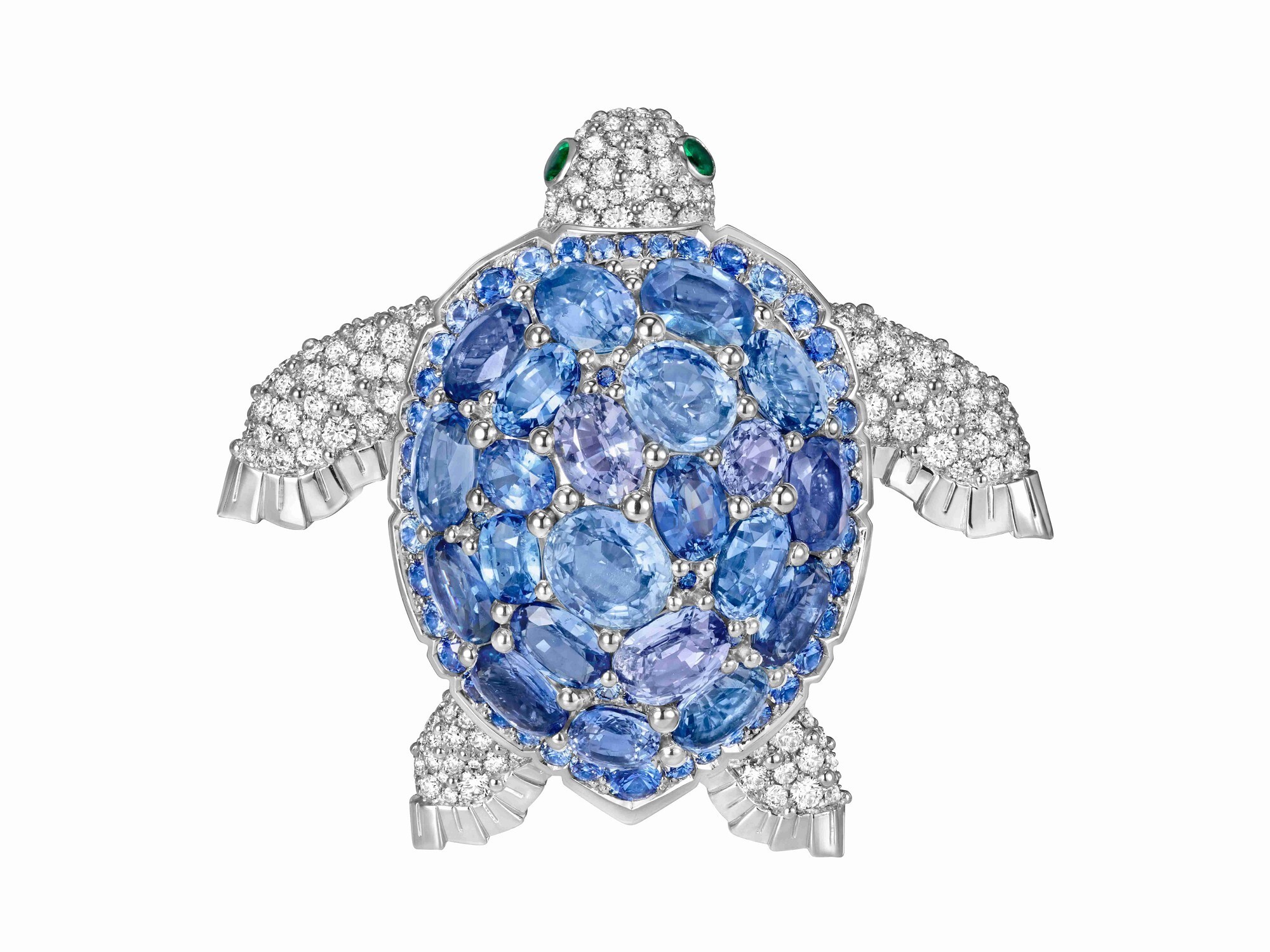 One turtle’s shell is set with oval-cut blue sapphires, arranged at varying angles to evoke the shimmering movement of the sea. Another features a shell set with violet and pink sapphires, delicately accented by diamonds and blue sapphires, recalling the vivid hues of a sunlit tropical island. The third turtle’s shell showcases engraved gold textures, with diamond-set intersections that bring a sense of radiance and refined opulence.