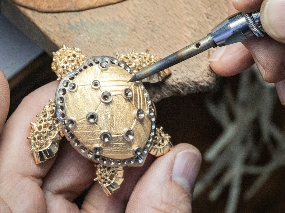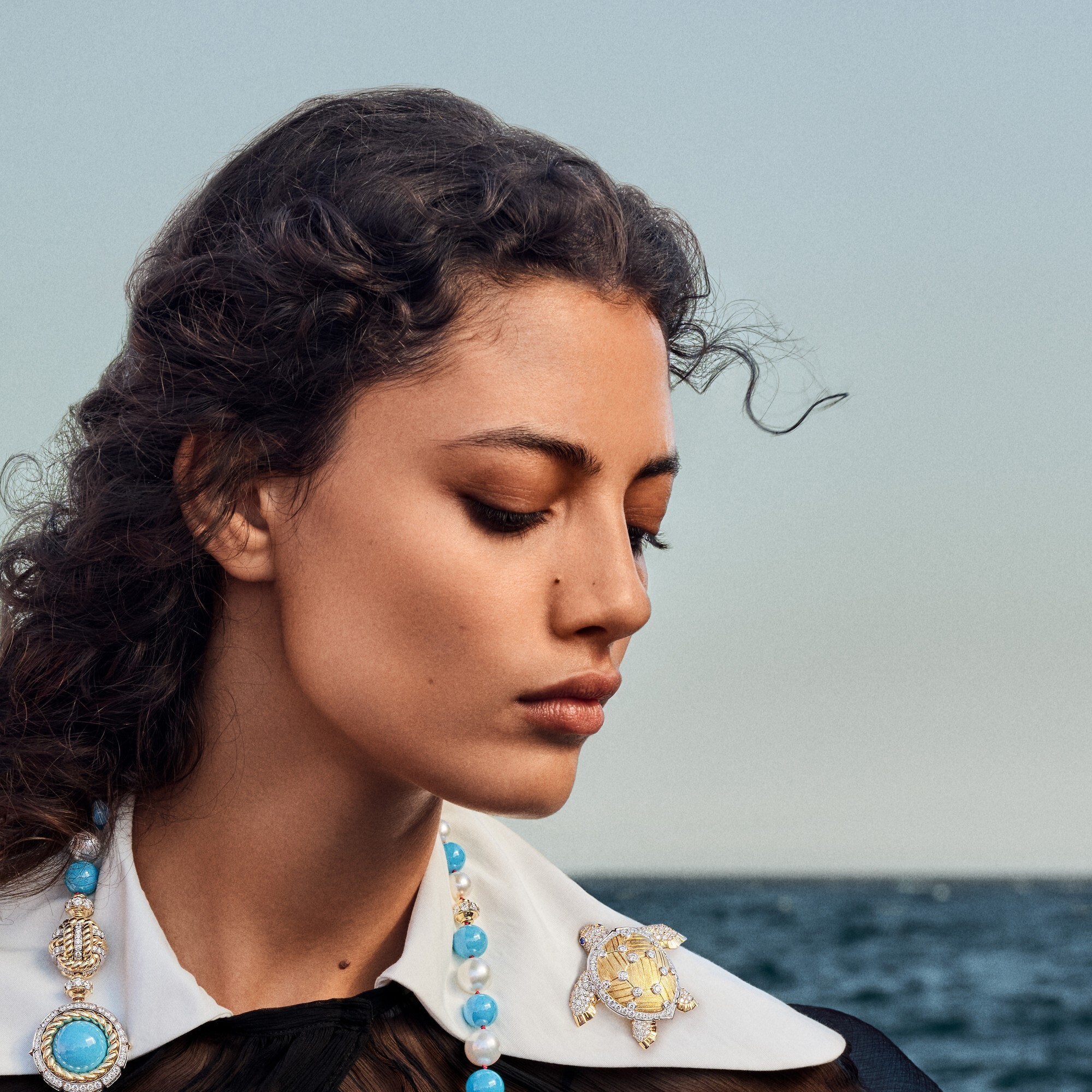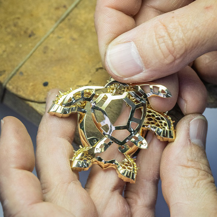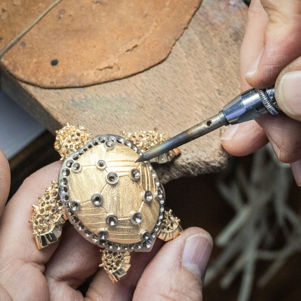 The designers used gold to sculpt the image of sea turtles gliding freely beneath the sun. The heads and limbs are pavé-set with round brilliant-cut diamonds, their sparkle complementing the colorful gemstones adorning the shells. The eyes are set with cabochon-cut emeralds or sapphires, giving each turtle an expressive and whimsical personality. Textured engraving and mirror polishing along the shell edges and flippers enhance the visual depth and three-dimensional realism.